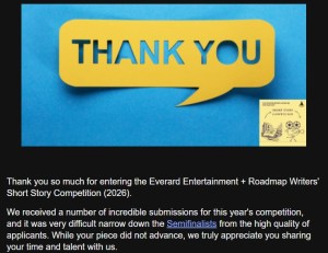 So honored to have been selected as a quarterfinalist in Everard Entertainment + Roadmap Writers’ Short Story Competition. In a very, very crowded marketplace, recognition can be elusive, and impostor syndrome runs rampant, even among writers whose work I consider excellent. Receiving this honor has given me a sense of confidence and validation in my own work, one that I hope to put to good use in future projects.